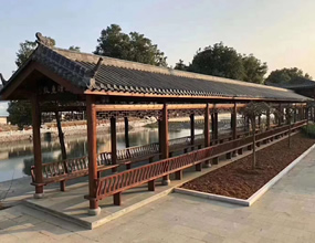 山西客戶景區定做的防腐木古建小青瓦長廊 這是山西客戶張總定做的30米防腐木古建小青瓦弧形長廊,面積是80平方米左右。9月份張總從網上了解到我們是做防腐木長廊的廠家,剛好他有個景區